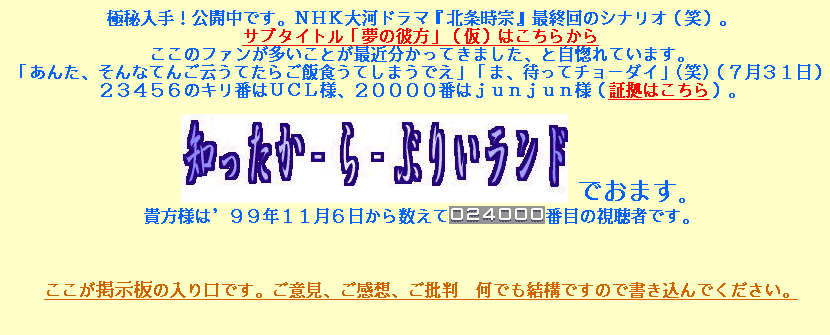 更新記録 創作時代劇こんと 『天狗が走る』 ('00年10月29日更新) 架空大河 『雄飛雌翔』 ('01年12月25日 一部更新) お馬鹿大河企画 ('02年1月1日更新) ぢごくの映画館 ('01年3月4日更新) それ行け! 必拙手直人 ('00年6月11日更新) |